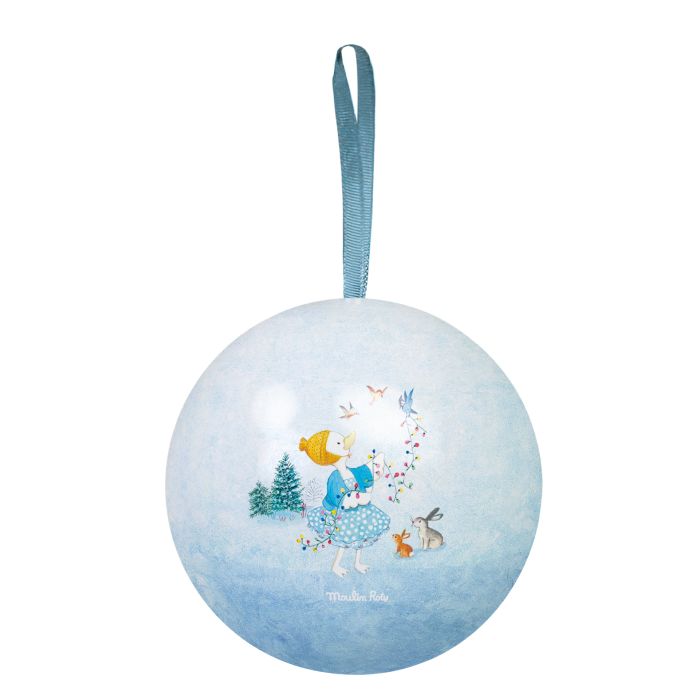 Ravissante petite boule de Noël en métal bleu aux illustrations délicates, pleines de détails et de poésie de Camille Jourdy représentant Jeanne la cane, sous la neige, accompagnée de ses amis les lapins et les oiseaux dans ses préparatifs de Noël.