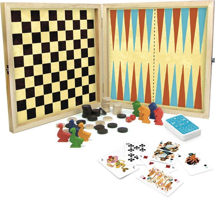 Une collection de jeux classiques dans un joli design Vilac ! La collection de jeux comprend : la dame, le moulin, le jeu de l'oie, le jeu des petits chevaux et un jeu de cartes.