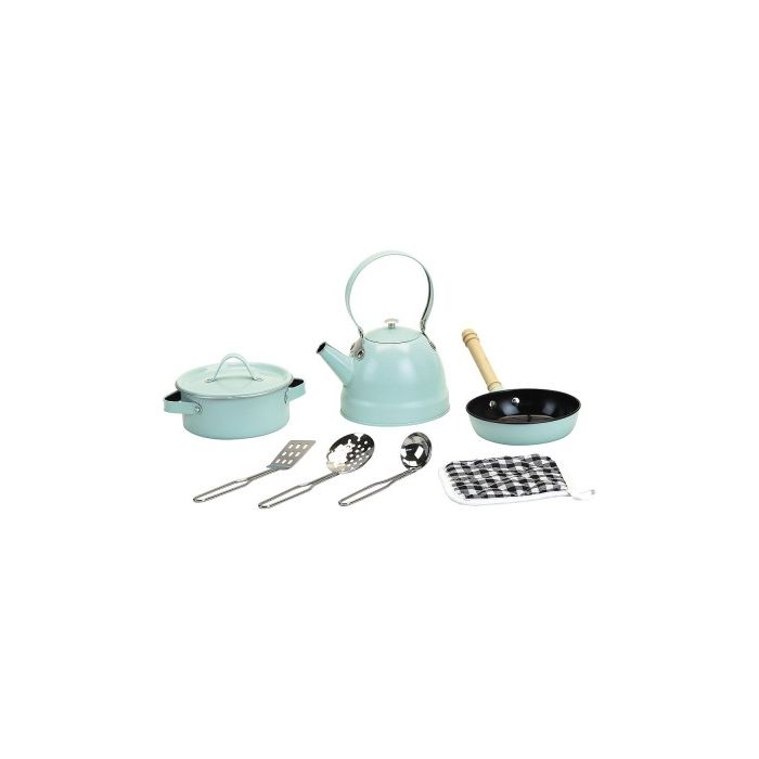 Set de cuisine vintage robuste et joli de Vilac pour les petits maîtres cuisiniers ! Petite casserole, poêle et bouilloire sont inclus dans l'ensemble, ainsi qu'une manique à carreaux et 3 ustensiles de cuisine en métal. 7 pièces de métal, à partir de 3 ans.