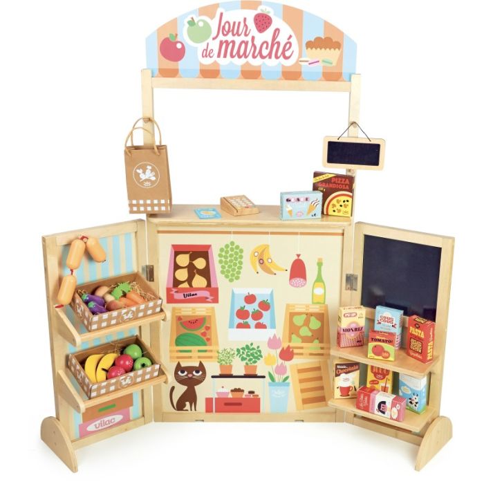 Marchande en bois accompagnée de set de fruits & légumes, de différentes boîtes de produits, d'un lecteur de carte bancaire et de nombreux autres accessoires. Les panneaux latéraux se replient pour faciliter le rangement. Tranche d'âge 3 ans et +/ Dimensions 53 x 110 x 47 cm/ avec 30 accessoires.