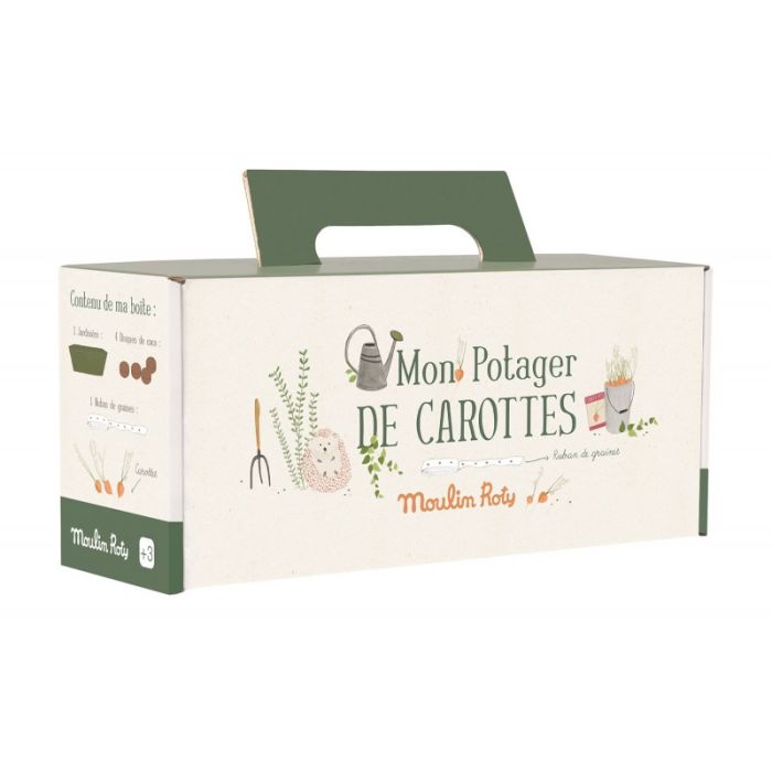 Kit conçu comme un véritable atelier d’éveil, comprenant : 1 jardinière verte en plastique, 1 ruban de graines de carottes, 4 disques coco. On dispose tout d’abord les disques de coco, on arrose et les disques se transforment en terre à répartir dans la jardinière. On creuse un petit sillon dans la terre de la jardinière pour y déposer le ruban de graines. On arrose de manière régulière le ruban, on recouvre de terre et le tour est joué ! On regarde pousser ses carottes, idéal pour apprendre le jardinage tout en s'amusant! Age: dès 3 ans Dim. boite : L 30cm x l 9,5cm x H 12,5cm