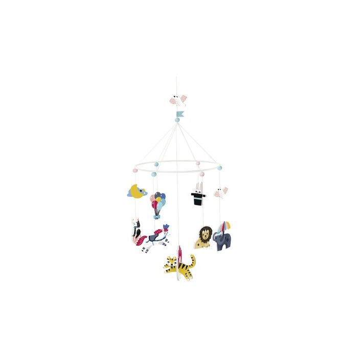 Voyage avec nous dans l'univers ludique de l'illustratrice danoise Michelle Carlslund. Depuis 2018, Michelle Carlsund fait partie de la famille Vilac et a conçu et illustré une merveilleuse collection de jouets, un monde de couleurs douces et fraîches, d'animaux amusants et de formes douces. Michelle est inspirée par tout ce qui l'entoure. Ses créations sont délicates et poétiques, un univers stylisé et enfantin qui se marie parfaitement avec les jouets Vilac, les mobiles délicats de l'illustratrice sont un joli accroche-regard pour petits et grands dans leur chambre et une belle distraction pour le bébé lors du changement de couches par exemple. Les motifs du cirque dansent dans le vent. En piste ! Taille : 25x60x25cm