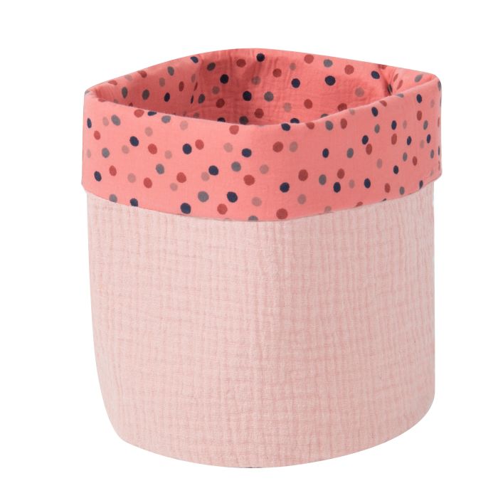 Pour les petites affaires de bébé, panier de rangement cylindrique en lange gaufré rose et revers imprimé plumetis en popeline de coton. Cette panière très pratique et graphique est aussi un ravissant accessoire déco qui s'accommode partout dans la maison.