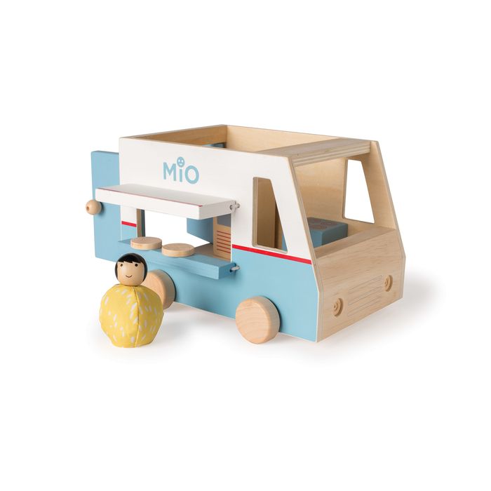 Joue avec le Food Truck MiO. Il vient avec des cubes en bois suggérant un four et un réfrigérateur ainsi que quatre disques de bois. Le camion est fabriqué avec un mélange de bois peint et naturel, comporte 4 roues fonctionnelles, des portes arrières qui s'ouvrent ainsi qu'un toit ouvert. Il ne vous reste plus qu'à ouvrir la fenêtre et de servir tous vos clients ! Vient avec un personnage MiO.
