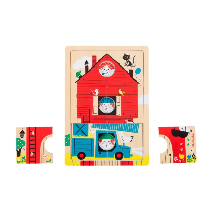 Puzzle en bois aux illustrations joyeuses et graphiques avec 3 niveaux superposés et 6 pièces par étage. Chaque étage dans une couleur vive dominante représente les 2 bambins, garçon et fille dans une situation rigolote à découvrir!